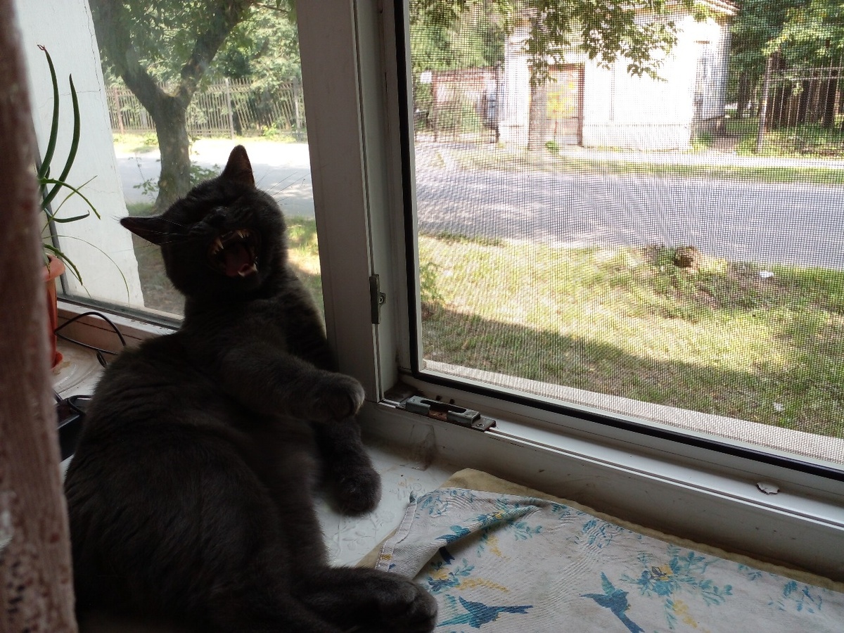 И снова жара! Ничего делать не хочется! Только зевать, да спать. Попробовал гулять самостоятельно (подружка теперь отпускает одного), так по асфальту наступать жарко. Подумал-подумал, да домой пошел. Дома можно прохожих в окне разглядывать, смотреть на подружкином телевизоре кошачьи "сериалы" про птичек, или рыбок. А еще подружка "жужжалку" включает. Раньше ветер из жужжалки горячий был. Котик грелся зимой. А теперь холодным жужжит. Дарику не нравится, а подружка говорит, что с жужжалкой попрохладнее стало. Ей виднее, у нее шубы нет. Дарику бы поспать в тенечке. Надоест спать на одном окне - перехожу на другое. Раньше на полках цветы стояли, но кот решил, что это более подходит для него. Подружка согласилась и даже лежаночку устроила. Вот так на жаре день и проводит кот: то спит, то зевает. Только вечером сил хватает в мячик чуточку поиграть с подружкой, или за зайчиком побегать. И для еды сил нет. Полтора пакетика в день, да штучек десять "сушек" (по пяточку утром и вечером). Бол