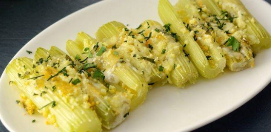 Ингредиенты: - 1 головка сельдерея - 30 г сливочного масла - 2 стакана куриного бульона - 2 ч. л. лимонной цедры, мелко натертой - ¼ стакана лимонного сока - ¼ стакана сливок - 2 яичного желтка - 1 ст. л. кукурузной муки (крахмала) - ¼ стакана петрушки, нарубленной - душистый перец и соль по вкусу - ½ стакана молотой шелухи мускатного ореха Приготовление: Немного смажьте маслом небольшую жаропрочную форму объемом около 1,5 литра. Разогрейте духовку до температуры 180°C. Почистите сельдерей и порежьте их кусочками длиной примерно 5 см. В большой сковородке растопите масло. Выложите туда нарезанный сельдерей, аккуратно перемешайте, чтобы кусочки равномерно покрылись маслом. Закройте крышкой и готовьте 2 минуты. Затем залейте содержимое кастрюли бульоном с добавлением лимонной цедры и сока лимона, снова накройте крышкой и варите еще 10 минут на маленьком огне. Достаньте готовый сельдерей с помощью шумовки и переложите в заранее приготовленную емкость для запекания. Отлейте четверть стакан