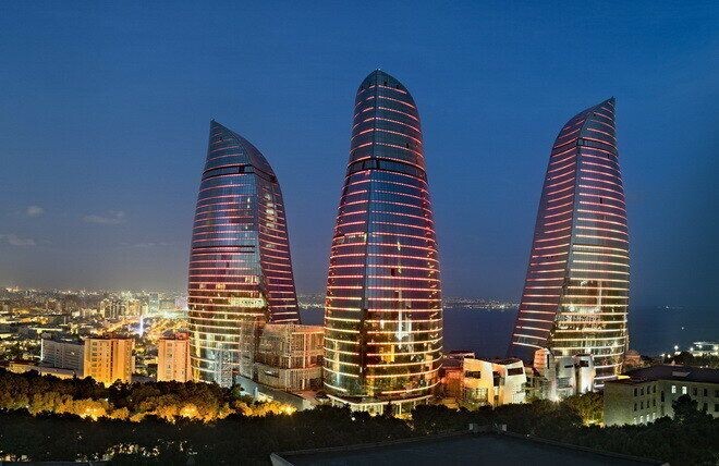 «Пламенные башни» — три небоскрёба, расположенные в центре Баку. Их внешний вид сразу привлекает внимание и символизирует пламя, что подчёркивает связь с историей и культурой Азербайджана. Башни напоминают языки пламени, смотрящие ввысь, устремлённые к небу, создавая динамичный и современный силуэт городской панорамы. Эта архитектурная композиция не просто часть городского ландшафта, а знак возрождения и прогресса. Комплекс занимает видное место на береговой линии Каспийского моря, что обеспечивает великолепные виды из окон зданий.