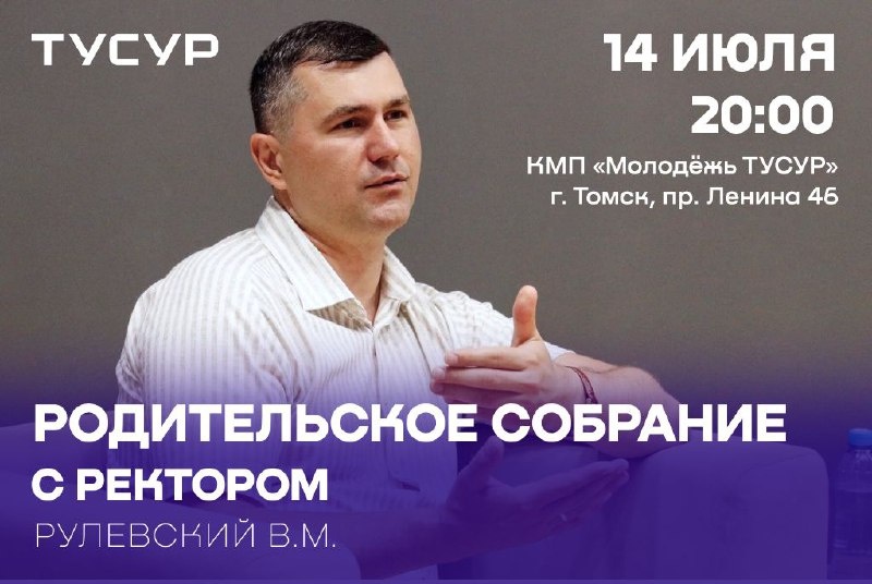Встреча с ректором ТУСУРа для родителей абитуриентов Томский государственный университет систем управления и радиоэлектроники приглашает родителей абитуриентов на традиционную встречу с ректором университета Рулевским Виктором Михайловичем. Мероприятие состоится 14 июля в 20:00 (по томскому времени) в КМП «Молодёжь ТУСУР» по адресу: г. Томск, пр. Ленина, 46. О мероприятии