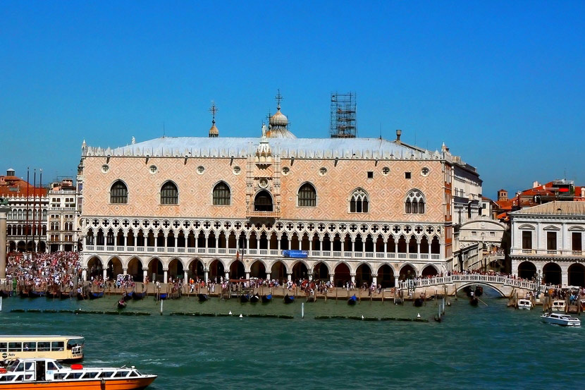 Со стороны площади дворец открывается величественным фасадом с изысканными арками и колоннами, задавая тон всей городской панораме. С противоположной стороны он граничит с Пьяцеттой Сан-Марко — набережной, где причаливали государственные и торговые корабли. Эта связь с водой подчёркивала статус города как морской республики и центр морской торговли. От дворца к площади ведёт знаменитый мост Риальто — одна из важнейших городских артерий.
