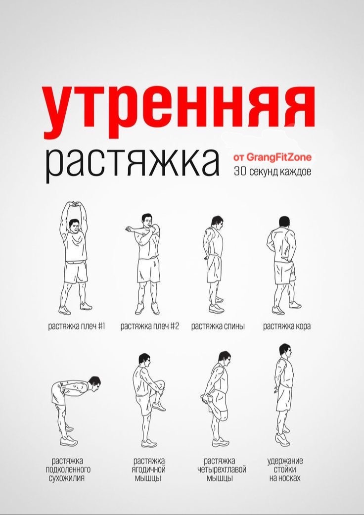 Всё просто и ничего сложного, как проснулся налей себе стакан прохладной воды (можно с лимоном, лишним это не будет). Прими удобное положение стоя, в месте где достаточно пространства и приступай к растяжке. Но обрати внимание рекомендую выполнять каждое упражнение по 30 секунд. Утренняя растяжка от GrandFitZone: Для правильного и точного выполнения упражнения смотри прикреплённую картинку-тренера. Но не забывай что при выполнении ты должен чувствовать своё тело - не переусердствуй! Подписывайтесь @GrandFitZone и не упускайте возможность бесплатно познавать фитнес с нуля.