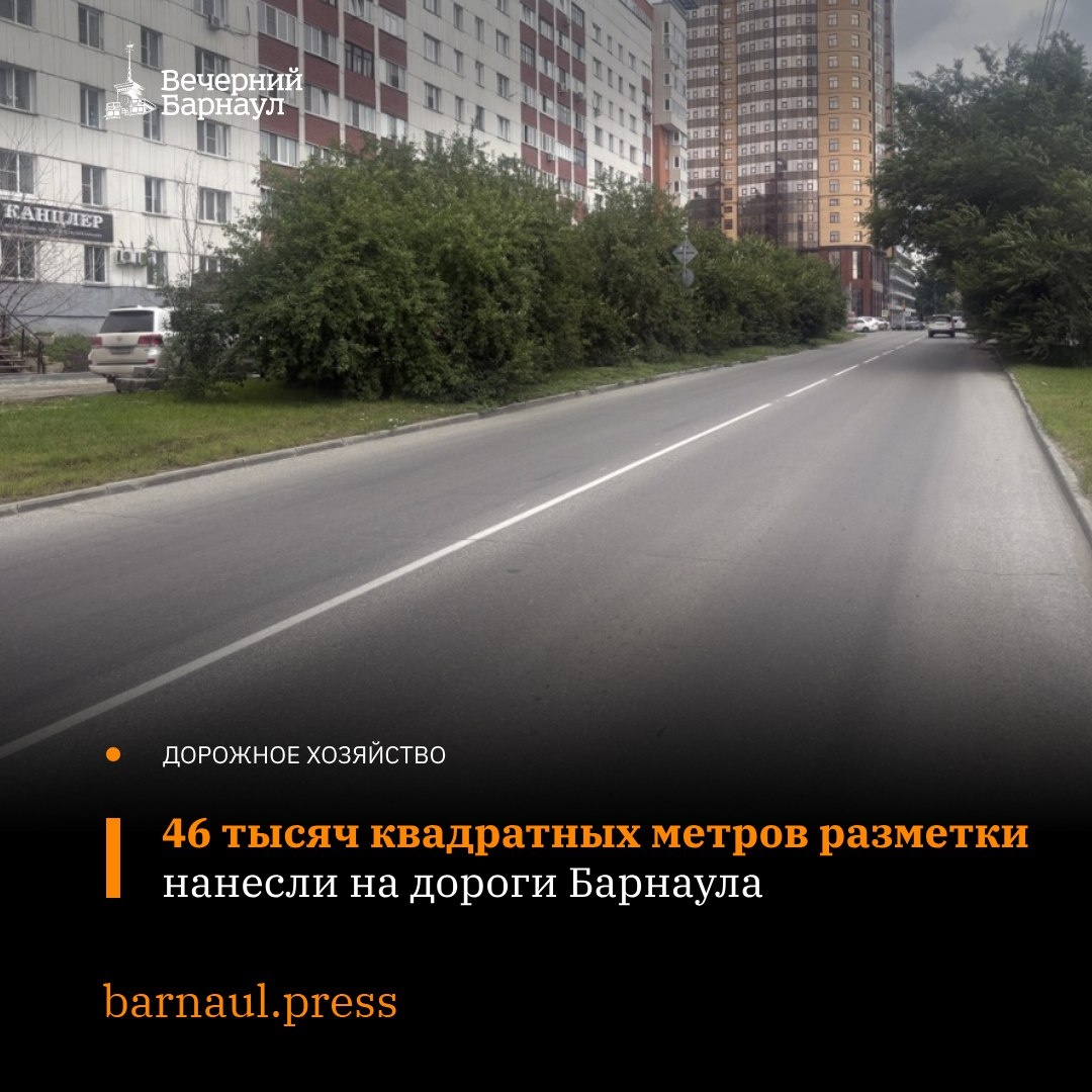 В Барнауле наносят и обновляют разметку на проезжих частях. На сегодняшний день её общая площадь составляет 46 тысяч квадратных метров, в том числе 14 тысяч «квадратов» — из износостойких материалов. Так, эти работы прошли на следующих участках дорог: 🔸улица Максима Горького от дороги на «Парус» до улицы Гоголя; 🔸улица Партизанская от Социалистического до Челюскинцев; 🔸переулок Ядринцева от Партизанской до Строителей; 🔸улица Островского от Новгородской до Антона Петрова; 🔸улица Георгия Исакова от Малахова до Попова; 🔸улица Советской Армии от Павловского тракта до Малахова; 🔸улица Пионеров от Ленина до Калинина; 🔸улица Цеховая от Калинина до Комсомольского; 🔸улица Сизова от Калинина до Комсомольского; 🔸улица Профинтерна от Комсомольского до Строителей. О том, где ещё наносят разметку, читайте на нашем сайте. Фото: barnaul.org @barnaul