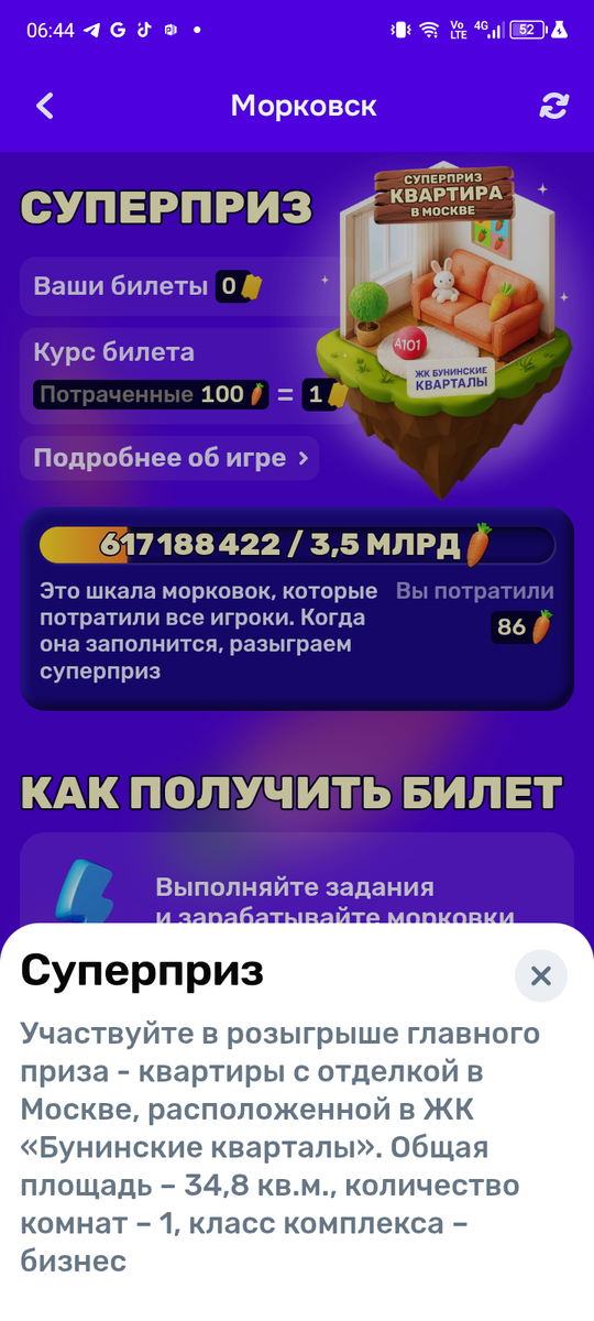 Даже покупая лотерейный билет и то есть большой шанс выиграть крупный приз. Для меня лично Озон запускает такие розыгрыши исключительно в целях маркетинга. Ведь для участия в конкурсе не нужно тратить деньги на лотерейный билет, а всего лишь покупать товар партнёра на определенную сумму. Сейчас там происходят розыгрыши призов в игровой форме. Собирай морковки и набирай билетики для выигрыша квартиры. Ну вот фото выше подтверждает, что данная скидка на такой формат товара, такое себе. Если бы крутился барабан и выпал ноль даже не так обидно было, но маркетплейс он больше заинтересованы на продажах и не имеет значения что и как продавать, важно что покупатель может заинтересоваться данной опцией. И вот, долгожданный розыгрыш супер приза, Квартира в Москве в Бунинских кварталах в стоимость около 8 миллионов рублей, ну неужели многие думают что реально можно выиграть такой приз, нет ребята такого не существует. Вся эта схема с розыгрышами давно придуманная игра для покупателей, бесплат