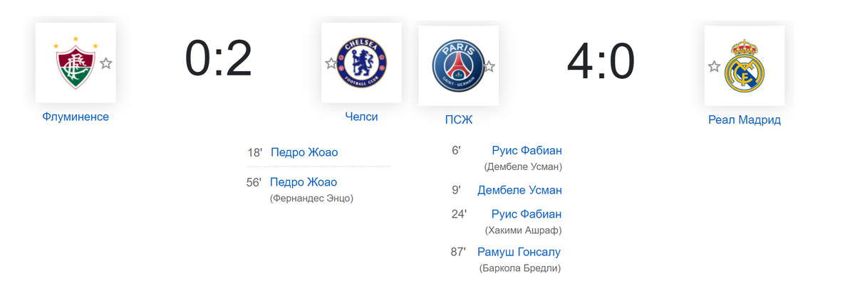 Привет всем. На клубном чемпионате мира определены финалисты сезона 2025 года. В первом полуфинале Клубного чемпионата мира между собой сразились бразильский «Флуминенсе» и английский «Челси». Европейский коллектив смог добыть уверенную победу над южноамериканским, в каждом из таймов по разу поразив ворота соперника. Автором дубля в стане лондонцев стал новичок Жоао Педро, отличившийся на 18-й и 56-й минутах. Дубль Жоао Педро принёс «Челси» победу над «Флуминенсе» со счетом 2:0. Подопечные Энцо Марески смогли пробиться в финал, где им предстоит сыграть против сильнейшего в паре «ПСЖ» (Франция) - «Реал» (Испания). Во втором полуфинальном матче Пари Сен-Жермен разнёс «Реал». Подопечные Луиса Энрике не испытали особых проблем с командой Хаби Алонсо и отгрузили в её ворота четыре безответных мяча. В составе победителей дублем отметился Фабиан Руис. Также голами за действующих чемпионов Франции отметились Усман Дембеле и Гонсалу Рамуш (4:0). Как сообщил после матча Луис Энрике, его лично по