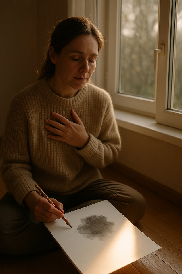 4. Спросите себя:Что помогло бы мне почувствовать больше уверенности, опоры, спокойствия? Иногда ответ приходит как цвет, символ, персонаж, ощущение. Нарисуйте это рядом или поверх или на отдельном листе — как если бы оно вошло внутрь образа тревоги.