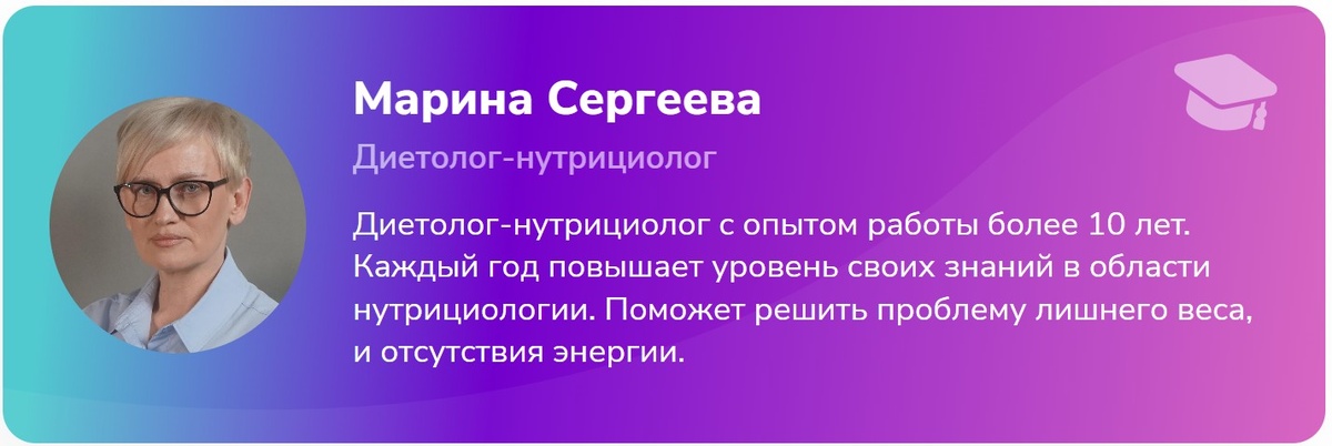 🔹 Ты получаешь знания от эксперта — Марины Сергеевой, диетолога-нутрициолога с 10-летним опытом
