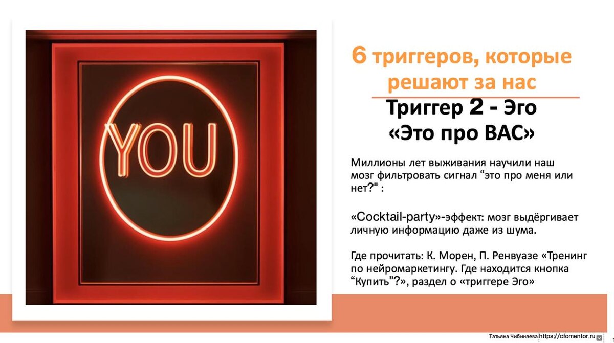 Как используют триггер 2 - ЭГО, управляя вашими решениями? С вами говорят в терминах вашей выгоды и потребностей. Фраза “тебе это даст…” мозг услышит быстрее, чем “наша компания то-то…”. Даже в общении с командой: связывать задачи с личной значимостью (“это шанс проявить себя”) – и у сотрудников появляется внутренний импульс действовать. И вроде бы знаем все про то, что людей интересуют только они сами, но сидим на крючке ЭГО очень плотно… Согласны? Дайте знать 👍, если нет - 👎