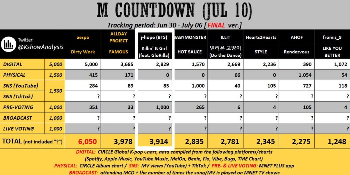 🪷 По финальным прогнозам M Countdown песня Хосока "Killin' It Girl" находится на 3-м месте, но есть шанс попасть на живое голосование