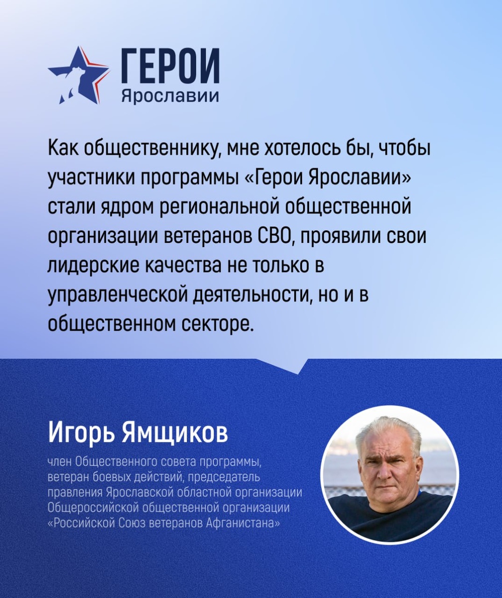 Участники программы «Герои Ярославии» встретятся со своими наставниками Именно они помогут ветеранам боевых действий в обучении, личностном и профессиональном развитии, поддержат при переходе на работу в органы власти. Напомним, Общественный совет программы «Герои Ярославии» в конце июня назвал 34 финалиста, которые пройдут обучение в первом потоке. Еще 28 бойцов, которые сейчас на СВО, также вошли в состав победителей. Они смогут пройти обучение по возвращении к гражданской жизни.