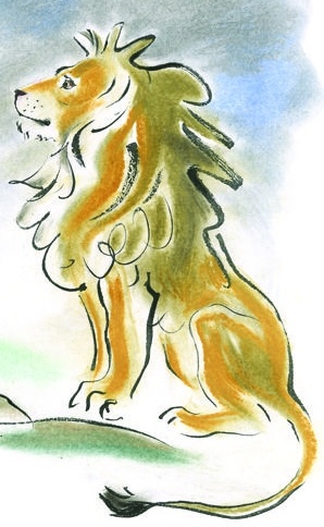 Трусливый лев лежал на травке, его огромная грива, обычно гордо развевающаяся на ветру, теперь поникла и сливалась с жухлой зеленью. Он вздыхал, его грудь тяжело поднималась и опускалась, а глаза, обычно полные огня и отваги, смотрели в небо с тоской и тревогой.