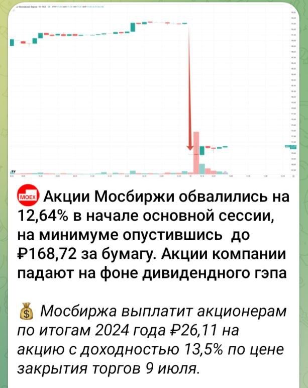 Снова забавляет РБК: вчера перед отсечкой торги закрылись на 192,98 руб. Дивиденд - 26,11. Сегодня на открытии котировка - 168,72. Разница с вчерашним закрытием - 24,26.