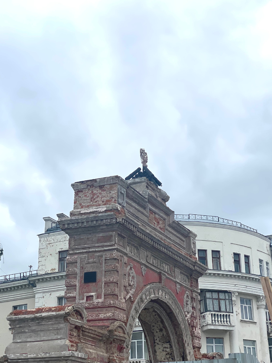 Мы с мужем проезжали на автобусе 45 по улице Первого Мая, и в окне мелькнуло необычное ярко-красное сооружение — старинная арка с белыми декоративными элементами. — Посмотри, какая красивая! — воскликнула я — Да, похоже на триумфальные ворота, — согласился муж. — Надо бы как-нибудь специально сюда приехать и рассмотреть её поближе. И вот, выбрав день, когда мы вновь пошли в театр "Созвездие", а ехать до него от дома приблизительно около часа, мы приехали заранее в этот район города, чтобы посмотреть на эту достопримечательность поближе. Все эти объекты, о которых упоминаю в статье, находятся в Кировском районе Казани - "Заречье" Подойдя ближе, мы смогли рассмотреть арку во всех деталях. Её праздничный красно-белый облик сразу бросался в глаза. На фронтоне чётко , по бокам , красовались вензеля — Екатерины II и Александра III. — Это Юбилейная арка, — подтвердила догадку мужа я,— Её построили в 1888 году в честь столетия Казанского порохового завода. Муж заметил, что арку возвели в