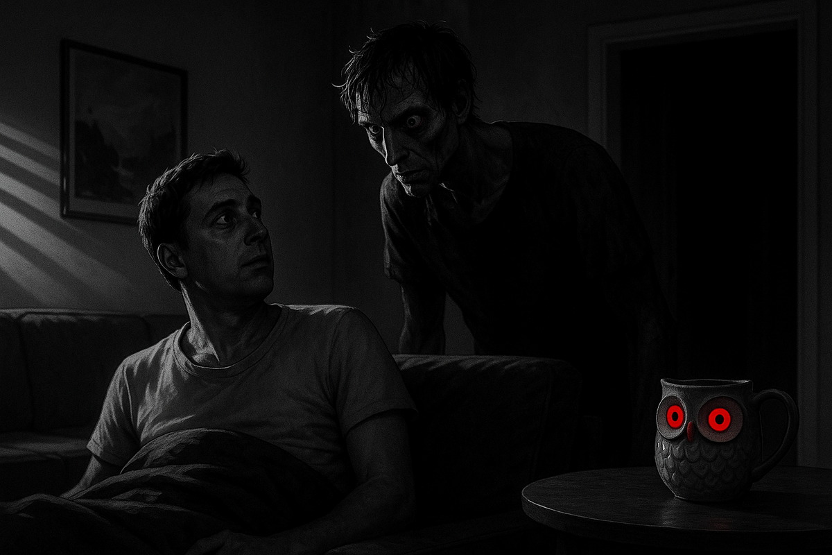 Я снова посмотрел на журнальный столик и на ту самую кружку-сову. Она была не просто чужой — она была неправильной. Глазки у неё были нарисованы криво: один смотрел прямо, а другой повернут в сторону, словно наблюдал за коридором позади меня.
