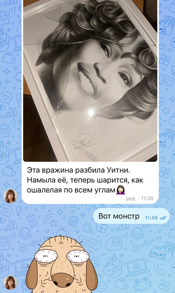 Тот момент, когда утро началось совсем не так, как хотелось бы….. «Вражина» — это кошка у родителей, которая любит шкодить😅 Пробежала вдоль портретов, которые весят у родителей, хвостиком махнула и снесла один из первых моих любимых портретов. И честно сказать, на момент, когда я его нарисовала, мне казалось, что вот она, моя планка. Я справилась с супер сложной для меня фотографией, смогла передать настроение, ЛОКОНЫ! Это для меня был настоящий прорыв)) Потому что когда только выбрала референс, я понятия не имела с чего мне начать и как я буду его рисовать😂 В итоге…справилась) Хоть и на каждом сантиметре думала «а как дальше? А что дальше?». Потому что четко знала, какой результат я хочу получить и просто шла к нему) Тем более на портрете Уитни не хотелось ошибиться, всё таки для меня это легендарная личность, с потрясающим голосом