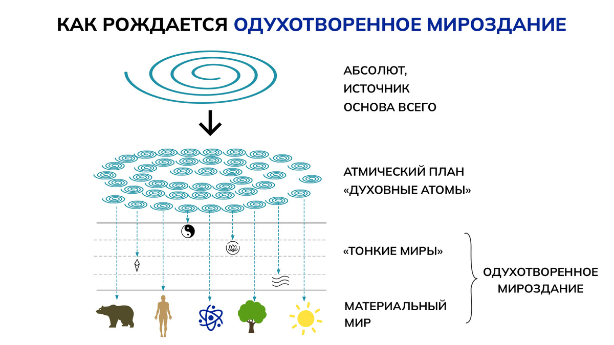 Один из законов Многоуровневого мироздания гласит: существование объекта на «нижнем» уровне невозможно без предшественника на «верхнем» уровне. Поэтому все, что существует, на всех «этажах» Мироздания, имеет в основе свой «атом Беспредельности». Нет ничего, что не имело бы духовной основы. Мир одухотворен. Духом обладает каждый объект Вселенной, от атома до звезды. Все есть Бог. Или – Бог есть Все.