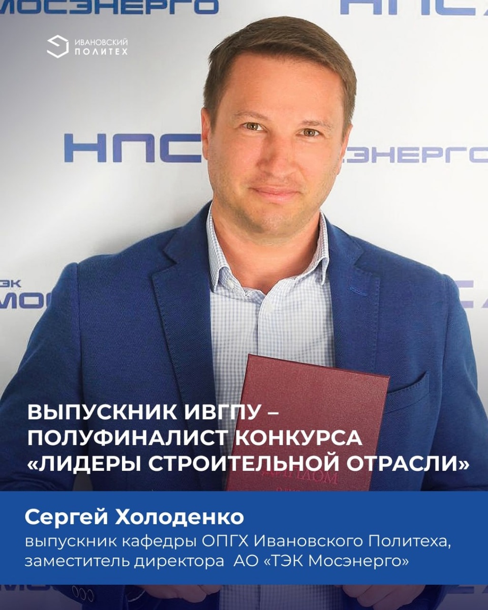 Выпускник Ивановского Политеха вышел в полуфинал Всероссийского конкурса управленцев «Лидеры строительной отрасли — 2025» 🎉 Сергей Холоденко, выпускник кафедры организации производства и городского хозяйства, заместитель директора по бюджетному планированию и консолидированной отчетности АО «ТЭК Мосэнерго» (ГК «Нацпроектстрой»), прошёл отборочные этапы и вошёл в число 300 полуфиналистов V Всероссийского конкурса управленцев «Лидеры строительной отрасли». Сергей в 2025 году окончил магистратуру по направлению 08.04.01 «Строительство» (магистерская программа «Ценообразование и управление проектами в строительстве и ЖКХ») и получил диплом с отличием. Из 23 547 заявленных участников лишь 300 человек (включая представителей Сербии, Турции и Египта) получили право продолжить борьбу в полуфинале. Финал конкурса пройдёт 7–10 августа в Ярославле 📅