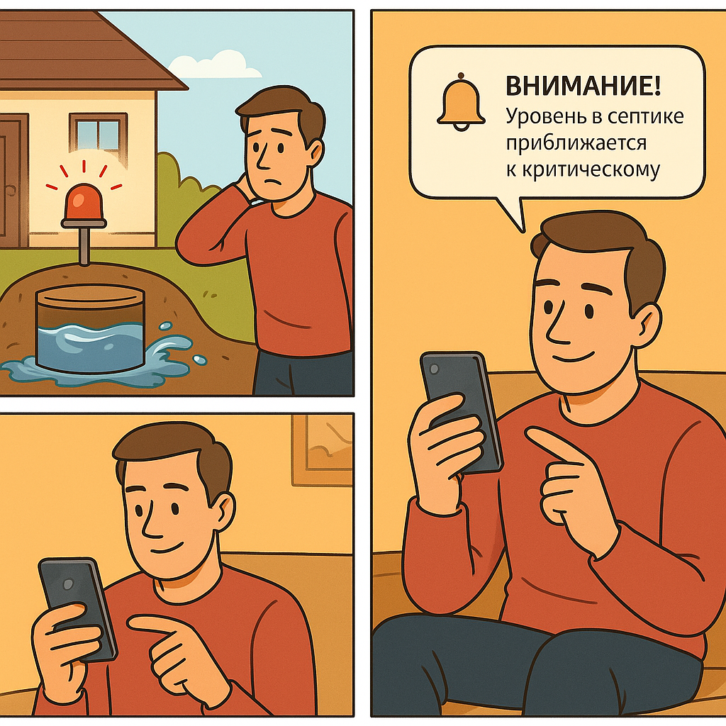 Во многих автономных станциях до сих пор используется простейшая сигнализация — лампочка на крышке, которая должна загораться при переполнении. Но кто её заметит? Особенно если вы бываете на участке только по выходным или живёте далеко. Мы создали современную замену таким «лампочкам» — G‑Septik. Это умный модуль для удалённого контроля септика через телефон. Вы видите состояние системы прямо в приложении, а при критической ситуации получаете push‑уведомление. Никаких сюрпризов — вы узнаете о проблеме заранее и сможете спокойно отреагировать, не дожидаясь аварии. G‑Septik выпускается в нескольких вариантах, в зависимости от уровня защиты: Простое решение, чтобы не допустить переполнения. Работает надёжно, но не показывает точный уровень. Позволяет отслеживать точный уровень жидкости в реальном времени. При этом не контактирует с отходами, поэтому служит дольше и безопаснее. Такой комплект помогает не только предотвратить переполнение, но и следит за работой компрессора и всей аэрационн