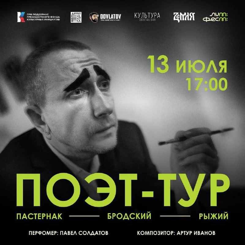 Литературный тур по барам Ульяновска: «Поэт-тур: Пастернак, Бродский, Рыжий» — это поэтическое путешествие по трем знаковым точкам города: «Земля», «Довлатов» и «Культура». Это не просто чтения — это живая драма и голос времени. В каждом баре помимо действа зрители смогут приобрести специально подготовленые для события напитки с поэтическим акцентом и по разумным ценам. Дорога между точками будет скрашена уличными перформансами на основе одного (абсурдного) факта из жизни каждого поэта. Павел Солдатов — перформер, куратор музыкальной лаборатории фестиваля «33» — оживит поэзию великих голосов XX века. Артур Иванов — музыкант — добавит к словам нойз–шугейзное звучание. 🗓️ 13 июля, старт в 17:00 Маршрут: 17.00–17.50 — Борис Пастернак –> бар «ЗЕМЛЯ», пер. Пожарный 8. 17.50–18.00 – уличный перформанс между барами 18.00–18.50 – Иосиф Бродский –> бар DOVLATOV, ул. Дворцовая 6 18.50–19.00 – уличный перформанс между барами 19.00–19.50 – Борис Рыжий, бар «Культура», ул. Дворцовая 8 Реги