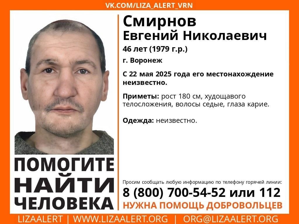 Внимание! Помогите найти человека! Пропал #Смирнов Евгений Николаевич, 46 лет. г. #Воронеж С 22 мая 2025 года его местонахождение неизвестно. Если вы обладаете какой-либо информацией о пропавшем, просьба позвонить по номеру телефона горячей линии отряда 88007005452 (бесплатно по РФ) или 112. ⚡️Подпишись на «Медиа-Х Воронеж»