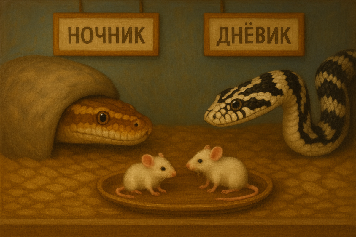 Личный опыт: моя подруга восхищалась роликом об идеальности маисовых полозов для новичков, но первые пару дней змей буквально не сидел на месте: выскакивал из укрытия, проверял каждую щель в крышке, рыл подкопы в субстрате в поисках путей к свободе и требовал пристального надзора, чтобы не дать ему осуществить свой план побега. У меня же королевский питон, напротив, надёжно сидит в укрытии и появляется лишь по графику кормления раз в неделю (или когда Его Величество соизволит показать свою персону на публике) — идеальный «тихий сосед», не требующий круглосуточного внимания.