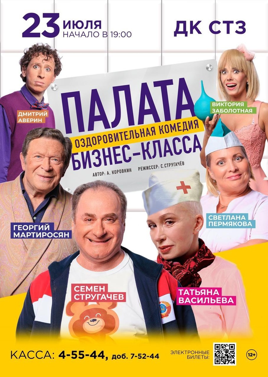 23 июля в Полевском на сцене ДК СТЗ – народные артисты России Татьяна Васильева и Семен Стругачев, Светлана Пермякова, Георгий Мартиросян и другие в оздоровительной комедии «Палата бизнес-класса»! В ролях: Разницкий – Семен СТРУГАЧЕВ, народный артист России Лариса Петровна – Татьяна ВАСИЛЬЕВА, народная артистка России Изумрудов – Георгий МАРТИРОСЯН, заслуженный артист России Илона – Светлана ПЕРМЯКОВА Феликс – Дмитрий Аверин Жанна – Виктория Заболотная Блистательная игра звезд сатирического жанра, неожиданные повороты сюжета и весьма реалистичные персонажи делают поход на спектакль отличным подарком для всех категорий зрителей. Продолжительность – 2 часа 30 минут (с одним антрактом) Электронные билеты: iframeab-pre2544.intickets.ru/event/6331... Тел. кассы: 4-55-44, доб. 7-52-44. Время работы: пн.-пт.: 8.00-17.00, перерыв: 12.00-13.00.