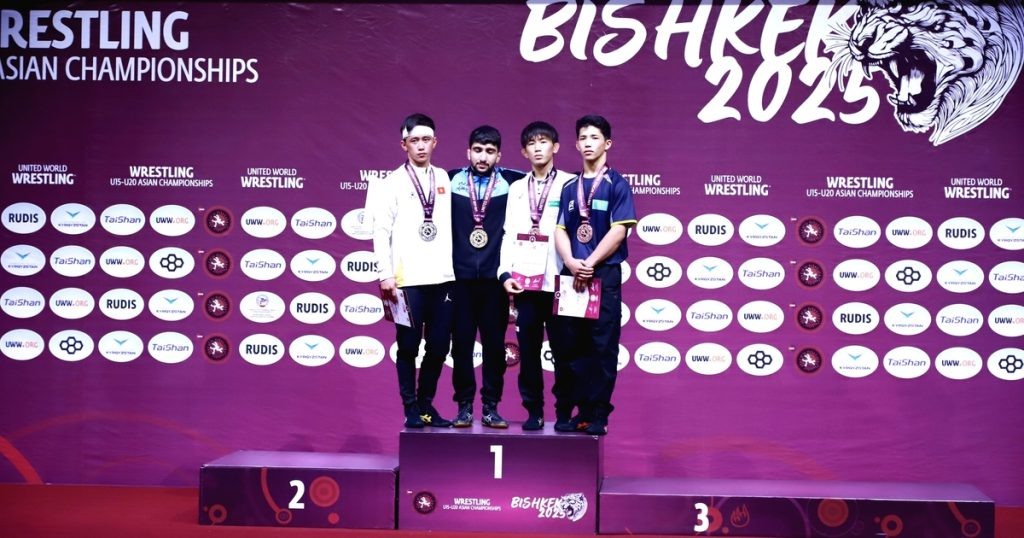 Бишкекте өткөн Азия чемпионатынын биринчи күнүндө кыргызстандык жаштар греко-рим күрөшүндө алтын, күмүш жана коло медалдарды жеңип алышты. Эмирлан Дүйшөналиев 63 кг салмакта Азия чемпиону болуп, 2017-жылдан бери биринчи алтынды алып келди. 🎉 Бишкекте жаштар арасындагы Азия чемпионатынын биринчи күнү ийгиликтүү аяктады. 🥇 Кыргызстандын жаштар курама командасы мыкты жыйынтыктарды көрсөтүп, алтын, күмүш жана коло медалдарды жеңип алды. 🏆 63 кг салмак категориясында Эмирлан Дүйшөналиев Азия чемпиону болуп, индиялык атаандашы Варунду 8:0 эсебинде утуп, Кыргызстандын намысын коргоду. Бул 2017-жылдан бери биринчи алтын медаль болуп саналат. 🥈 55 кг салмак категориясында Кутман Калбаев күмүш медаль алды. Ал финалда ирандык Паям Ахмади Балутакиге утулуп калды. 🥉 77 кг салмак категориясында Адилет Абыкеев коло медаль жеңип алды. Үчүнчү орун үчүн болгон таймашта ал өзбекстандык Бекмурод Рустамов менен беттешип, 1:1 эсебинде тең чыгуу менен активдүү аракеттери үчүн жеңишке жетишти. 🤼♂️ Мелд