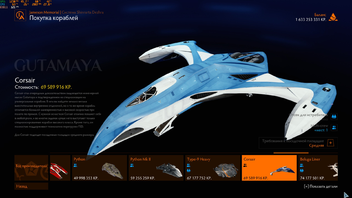 Corsair – очередное достижение инженерной мысли Gutamaya и доказательство их специализации на универсальных кораблях. В нем вы найдете немало весьма вместительных внутренних отделений, но в то же время корабль отличается большой маневренностью и высокой скоростью при полете по прямой. С нужной оснасткой Corsair отлично покажет себя в любой роли, и во многих задачах лучше него выступают только специализированные корабли высокого класса. Кроме того, он полностью поддерживает технологию перегрузки FSD.