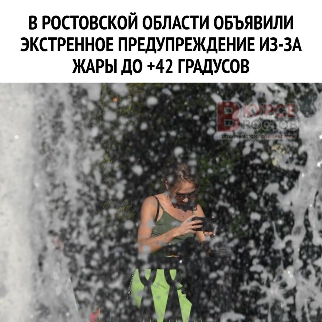 В Ростовской области объявили экстренное предупреждение из-за жары до +42 градусов По данным ГУ МЧС Ростовской области, в период 13-17 часов 10 июля, а также во второй половине дня с 10 по 13 июля ожидается сильная жара +40...+42 градусов.
