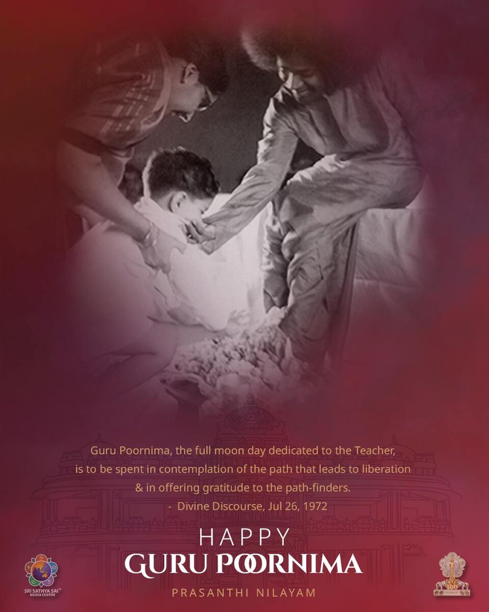 Саи Рам🙏 Глобальный Совет Шри Сатья Саи поздравляет всех с праздником Гуру Пурнима 🕊️ "Гуру Пурнима, день полнолуния, посвящённый Учителю, следует проводить в размышлениях о пути, ведущем к освобождению, и в выражении благодарности тем, кто его нашёл". Божественная беседа, 26 июля 1972 года.
