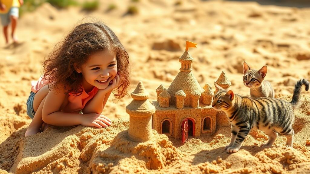 Песочный городок Юли и Льва Тёплое солнце скользило по песку, пока Юля вырезала углубление у самого края песочницы. На ладони у неё свернулся калачиком мелкий игрушечный лев — её любимый друг, непоседливый и всегда верный. — Твой черёд копать тоннель, — сказала Юля строго, присаживаясь на корточки. — Иначе городок будет без ворот. Лев, конечно, не возражал. Его рыжая грива всегда казалась Юле особенно блестящей, когда он «работал» в песке. Каждый вечер Юля строила новый городок, и каждый раз он получался другим: то с несколькими башнями, то с мостом из мокрой банки, а вчера — с настоящей крепостной стеной. Сегодня Юля мечтала построить круглый дворец с тайным проходом для льва. Пальцы быстро лепили стенки, глазки следили, чтобы ветер не унёс крышу. Вдруг в песочницу села кошка с полосатым пятном на боку. Она с интересом стала разглядывать игрушечного льва. — Хочешь к нам в городок? — Юля улыбнулась гостю. — Только аккуратно, у нас ещё ворота не готовы. Кошка принюхалась к «льву»