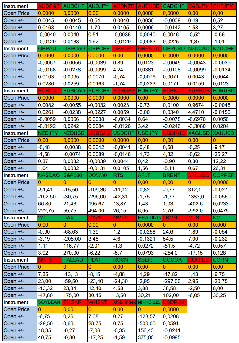 Весь перечень анализируемых активов указан ниже в общем количестве 62 инструмента. Здесь Вы найдете активы рынка Форекс, популярные активы Московской биржи, не менее популярные активы Чикагской биржи СМЕ и мажор криптовалютного сегмента - Биткоин, за которым следуют все альткоины.