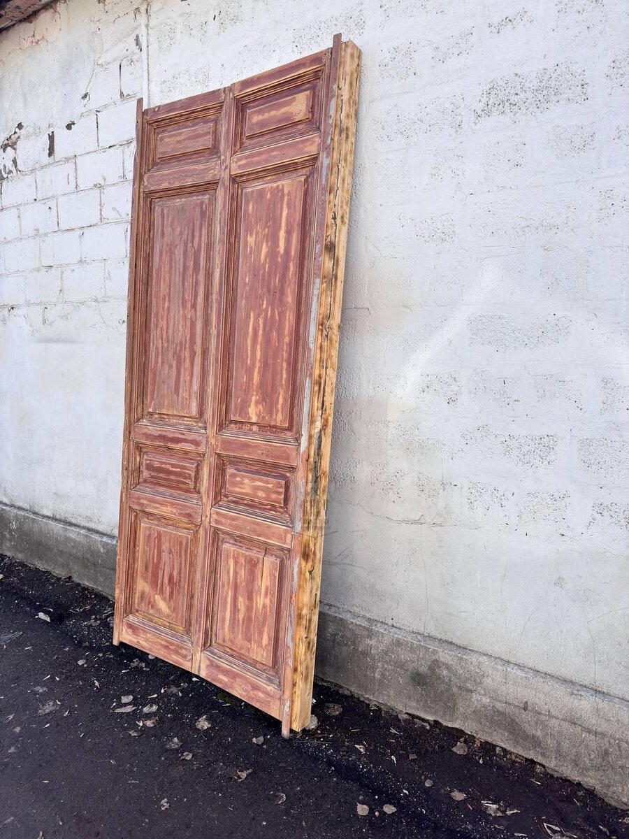Перед вами пара старых, массивных дверей, которые пережили не одно десятилетие — и не потеряли своей красоты. Мы сняли старую краску, подчистили древесину и бережно оставили след времени. В этих панелях всё настоящее: возраст, патина, благородная фактура.