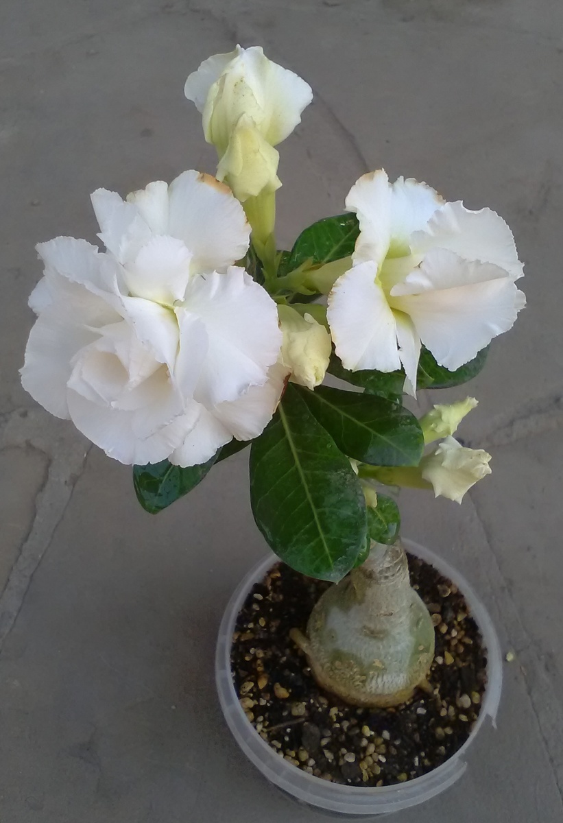 Wedding Dress, он же Свадебное Платье. Тоже одна из моих первых сортовых прививок. В прошлом году цвела впервые, и цветки были единичные. Осенью я его порезала на прививки, и теперь, после обрезки, он пошёл цвести целыми букетами! В начале роспуска лепестки с едва заметной желтизной у основания. Потом она уходит, и цветок становится белоснежным, с легким кремовым оттенком в середине. Цветки крупные, 7 см в диаметре, очень обьемные, кончики лепестков местами гофрированные. Цветёт охотно, сортик абсолютно без капризов. Единственное, в чем надо проявлять осторожность - это что бы вода не попала на бутоны. Вообще то такое правило распространяется на все сорта, но этот реагирует особенно болезненно, на месте попадания моментально образуются некрасивые желтые пятна, как ржавчина. Я свои адениумы опрыскиваю постоянно, потому что очень пыльно, и каждый раз при этом прикрывала бутоны, но всё равно не уследила, и немного ржавчинки всё таки есть на лепестках. Этот сорт ароматный, пахнет че
