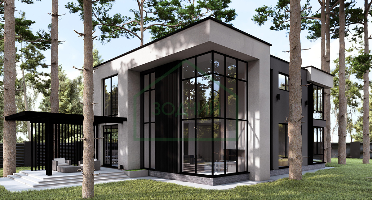 Что такое идеальный дом? У каждого свой ответ. Для кого-то это простор, для кого-то — тишина и приватность. Но если вы ищете дом, в котором будет всё сразу — посмотрите на этот проект. Проект дома из кирпича, с акцентом на естественный свет, воздух и продуманное пространство. Минимализм — не в смысле «мало», а в смысле «ничего лишнего». Современные загородные дома уже не просто про крышу над головой — это про ощущение жизни. Простор, много света, грамотная планировка и эстетика в каждой детали. Снаружи — сдержанная современная архитектура в стиле минимализм: простые формы, ровные линии, панорамные окна от пола до потолка. Фасад будто растворяется в окружающем сосновом лесу. Терраса — вровень с землёй. А свет внутри дома играет главную роль. В основе — классический прямоугольный объём с акцентами на деталях: горизонтальные карнизы, широкие подступы террасы, чёткий ритм фасадов. Планировка: воздух, зонирование и логика Всё пространство делится на приватную и общественную зоны. Кухня-гос