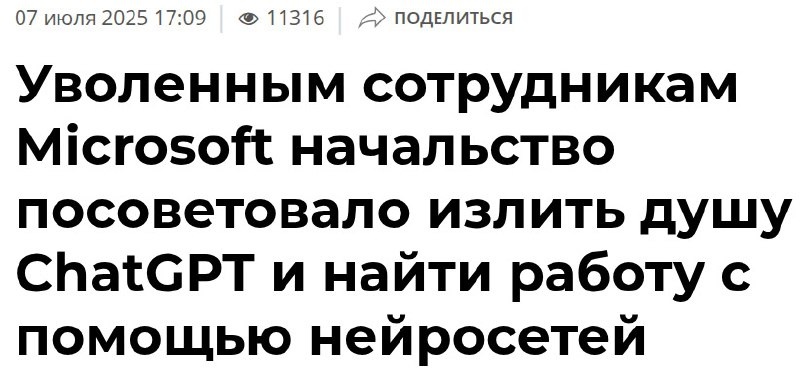 Microsoft уволила 9000 сотрудников и посоветовала им найти новую работу через ChatGPT Исполнительный продюсер Xbox Game Studios Мэтт Тернбулл решил поддержать уволенных коллег по-особенному — предложил им «излить душу» ChatGPT и использовать ИИ для поиска работы. Пост он потом удалил, но интернет помнит всё. Промпты от заботливого начальства: «Представь, что ты карьерный коуч. Меня сократили с [указать позицию] в игровой индустрии. Помоги мне составить месячный план, чтобы перестроиться, найти вакансии и начать подавать заявки без выгорания» «Вот моё резюме. Составь три адаптированных версии: одну — для ААА, одну — для платформенной или издательской позиции, и ещё одну — для руководителя стартапа или небольшой игровой студии» «Составь дружеское сообщение, которое можно отправить старым коллегам, дав им понять, что я открыт к новым возможностям» Реакция индустрии была предсказуемой: «После массовых увольнений не стоит предлагать искать утешение в технологиях, которыми вы пытаетесь и