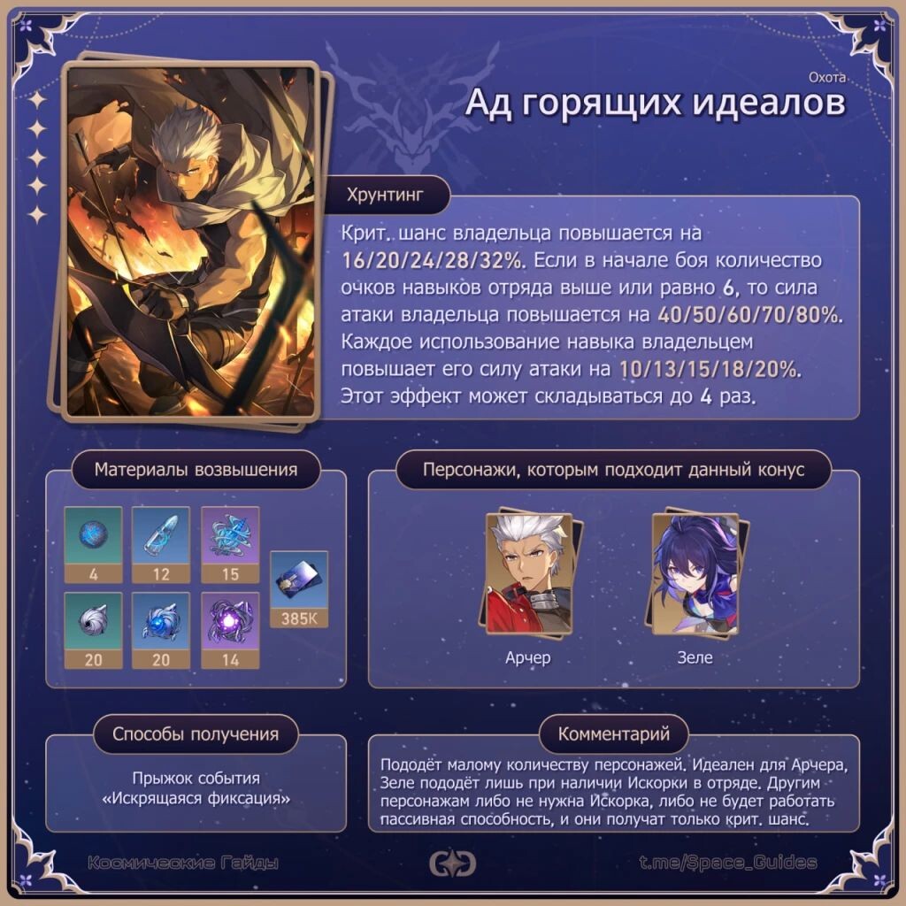 ㅤ«Ад горящих идеалов» — сигнатурный Световой конус Арчера, одного из персонажей коллаборации с франшизой Fate. Конус можно как выбить в лимитированном баннере, так и получить абсолютно бесплатно! Как это сделать и кому он понадобится? Рассмотрим подробнее в статье. ㅤС точным описанием умений конуса и материалов для его прокачки можете ознакомиться на следующем изображении: ㅤПовышает шанс крит. попадания на 16/20/24/28/32%. Если в начале боя лимит количества очков навыков выше или равно шести, сила атаки носителя дополнительно повышается на 40/50/60/70/80%. Каждое использование навыка повышает силу атаки владельца ещё на 10/12,5/15/17,5/20% и может складываться до 4 раз. ㅤНа момент версии 3.4 у этого Светового конуса есть несколько способов получения: ㅤ* Первый способ — из лимитированного баннера, связанного с коллаборацией Fate, где будет чистая история прыжков. Баннер будет доступен с 11 июля 2025 года и закроется через несколько версий. Пока неизвестно, будет ли реран персонажа, но т