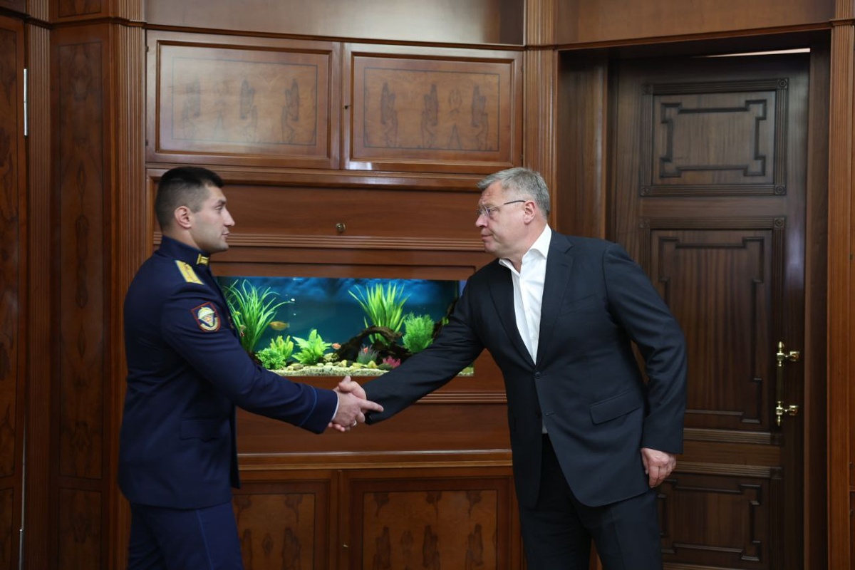 Губернатор Астраханской области Игорь Бабушкин провел рабочую встречу с участником специальной военной операции, дважды кавалером ордена Мужества Арсеном Мутелимовым.