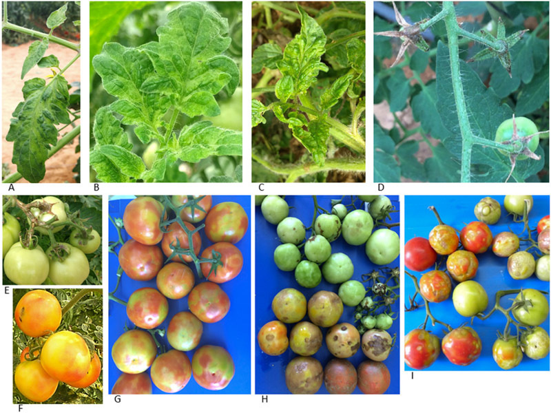 ToBRFV вызывает ряд симптомов на растениях томата (Solanum lycopersicum), которые зависят от времени заражения, конкретного сорта, стадии развития хозяина и условий окружающей среды. На листьях наиболее распространенными симптомами являются мозаика с темно-зелеными волдырями на старых, полностью развитых листьях. На молодых листьях вблизи верхушки могут наблюдаться желтые пятна и деформация листьев. Нередко некоторые листья имеют более сильную деформацию с уменьшенными межжилковыми поверхностями. Некоторые авторы сообщают о локализованном некрозе стебля. Иногда наблюдаются также некрозы цветоноса и чашечки. Иногда цветы также могут поражаться увяданием. Наиболее частым симптомом плодов является изменение цвета (желтого или зеленого) в определенных областях, распространяющихся внутрь. Тяжесть симптомов коричневой морщинистости с изменением цвета и деформацией зависит от конкретного сорта, времени заражения и, возможно, условий окружающей среды.