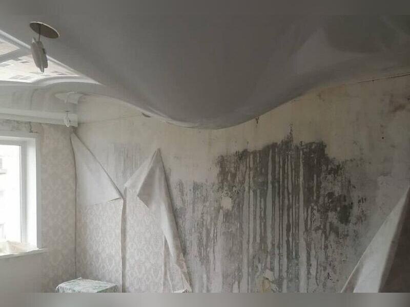На фото можно заметить, что натяжные потолки провисли под тяжестью воды, а обои уже отрываются.