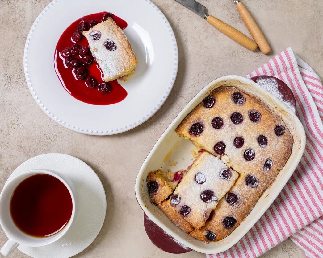 5. Смазываем форму (делаем французскую рубашку: смазываем форму сливочным маслом, присыпаем мукой и лишнюю муку стряхиваем). 6. Выкладываем часть теста и сверху большую часть вишни. 7. Выкладываем оставшееся тесто в форму. Украшаем сверху вишней, присыпаем сахарной пудрой и можно добавить миндальне лепестки. 7
