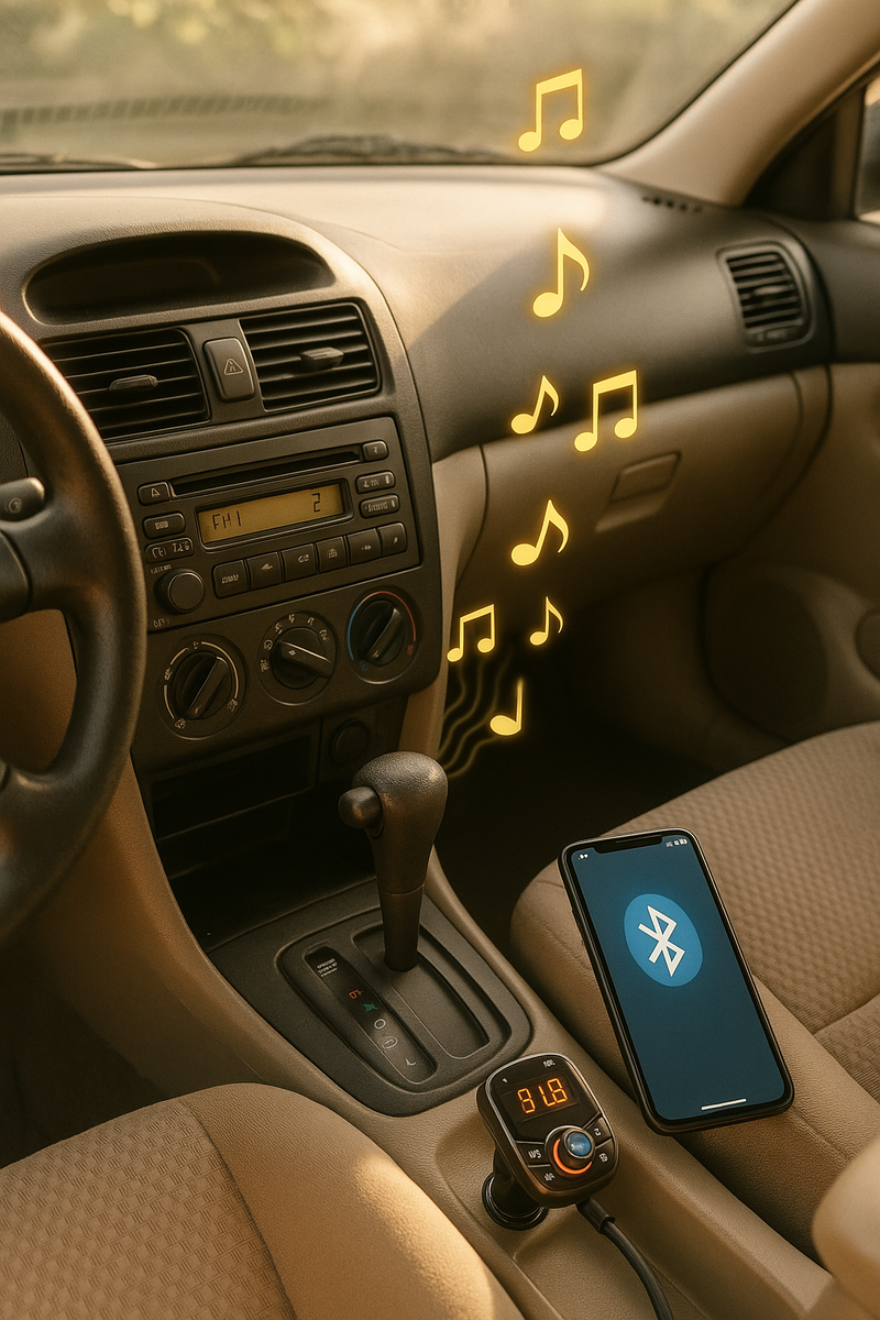 🔊 Музыка в машине без Bluetooth и AUX? Есть 3 решения — выбирай по бюджету Старенькая магнитола без Bluetooth, AUX и даже флешки? Не спеши менять всё сразу — вот 3 способа слушать музыку в машине, даже если она «ещё с тех времён»: Просто втыкаешь в прикуриватель, настраиваешь частоту и включаешь музыку с телефона по Bluetooth.