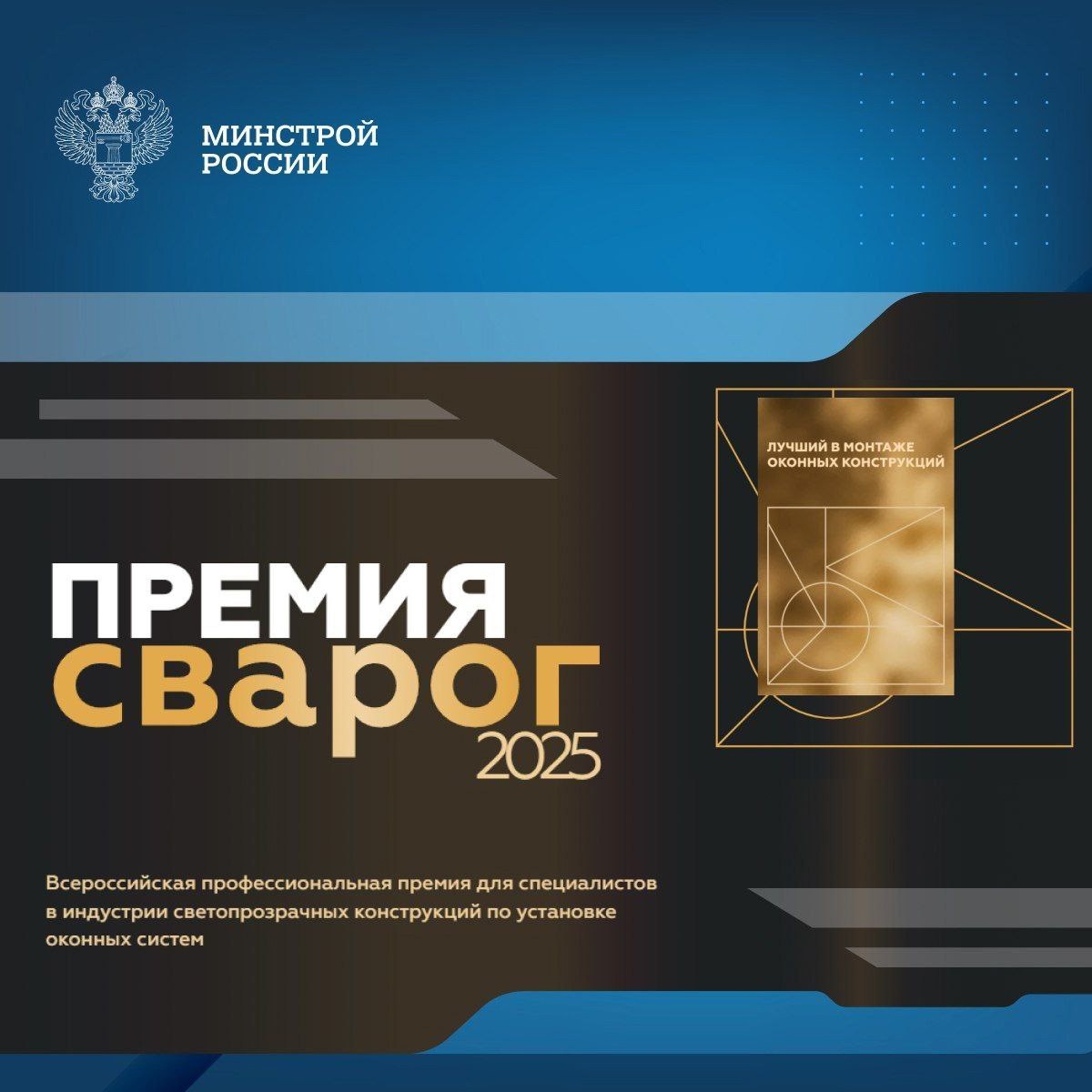 Всероссийская профессиональная премия «Сварог» 2025 – это признание мастерства, инноваций и вклада в развитие светопрозрачных конструкций – от окон и фасадов до сложных архитектурных решений. 🥇Номинации: • Просто окно • Крупногабарит и порталы • Мастер-наставник – за вклад в обучение новых кадров • Алюминиевые дверные блоки • Популяризатор профессии – за вклад в развитие отрасли Подробные условия участия ➡️ на сайте (https://svarog.expert/). Премия призвана повысить престиж рабочих профессий, поддержать талантливых специалистов и стимулировать развитие кадрового потенциала отрасли. Минстрой России