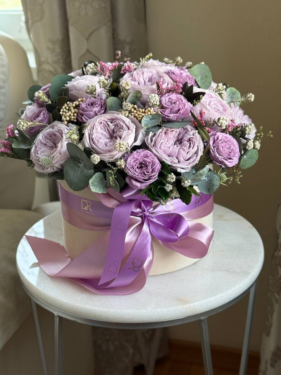 ⚜️Букет из сиреневых роз с эвкалиптом в коробке «Shimmer»