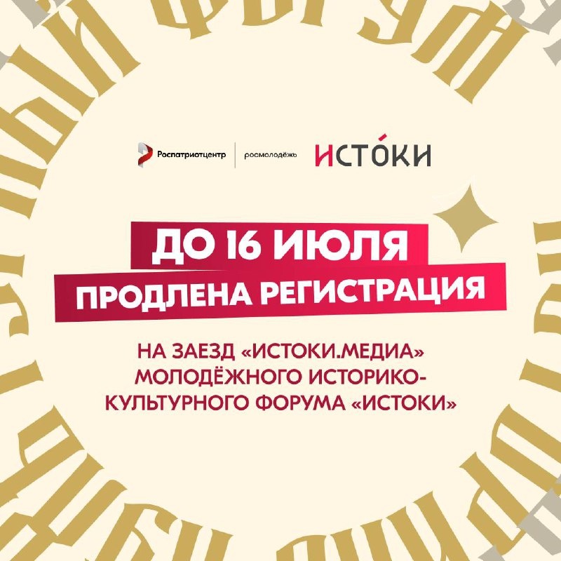 😉 Без лишних слов… Регистрация на участие в заезде «Истоки.Медиа» молодёжного историко-культурного форума «Истоки» продлена до 16 июля! Если вы не представляете свою жизнь без медиа, любите создавать контент и умеете снимать и монтировать даже на ходу, подавайте заявку и станьте частью заряженного сообщества. Вас ждёт насыщенная образовательная, культурная и полезная программы, новые знакомства и общение с единомышленниками. Не упустите возможность реализовать свои идеи и получить ценный опыт, вдохновение и поддержку профессионалов 🏆 ❤️ Подписывайтесь на Роспатриот