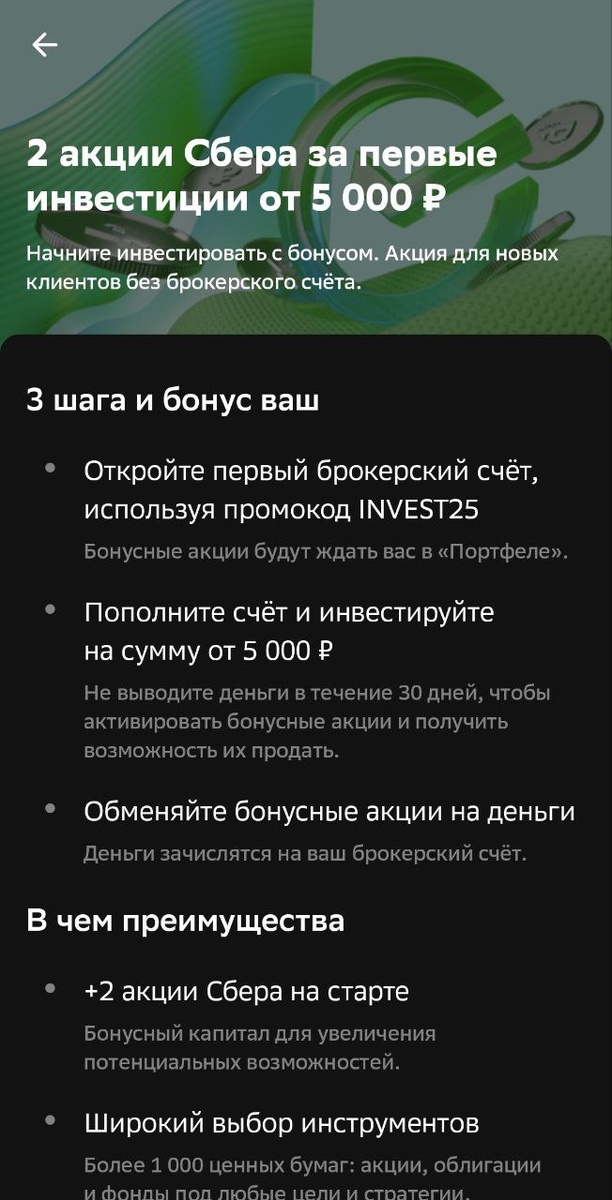 Π ΠΎΡΠ²Π΅Ρ Π½Π° ΠΏΠΎΡΡ π¦ ΠΡΠΎΠΌΠΎΠΊΠΎΠ΄ Π½Π° 2 Π°ΠΊΡΠΈΠΈ Π‘Π±Π΅ΡΠ° Π·Π° ΠΏΠ΅ΡΠ²ΡΠΉ Π±ΡΠΎΠΊΠ΅ΡΡΠΊΠΈΠΉ ΡΡΡΡ ΠΡΠΎ ΡΠ΅ΡΠΈΡ ΠΎΡΠΊΡΡΠ²Π°ΡΡ Π±ΡΠΎΠΊΠ΅ΡΡΠΊΠΈΠΉ ΡΡΠ΅Ρ Π² Π‘ΠΠΠ Π - ΡΠ΅ΡΠ΅ΡΠ°Π»ΠΎΠΊ Π½Π΅Ρ, Π½ΠΎ Π½Π°ΡΠ΅Π» Π² ΠΏΡΠΈΠ»ΠΎΠΆΠ΅Π½ΠΈΠΈ Π‘Π±Π΅Ρ ΠΠ½Π²Π΅ΡΡΠΈΡΠΈΠΈ ΠΏΡΠΎΠΌΠΎΠΊΠΎΠ΄ Π½Π° 2 Π°ΠΊΡΠΈΠΈ Π‘Π±Π΅ΡΠ° Π΅ΡΠ»ΠΈ ΠΏΠΎΠΏΠΎΠ»Π½ΠΈΡΡ ΠΠ‘ Π½Π° 5000 ΡΡΠ±Π»Π΅ΠΉ. Π₯ΠΎΡΡ Π±Ρ Π²ΠΎΡ ΡΠ°ΠΊΠΎΠΉ Π½Π΅Π±ΠΎΠ»ΡΡΠΎΠΉ Π±ΠΎΠ½ΡΡ Π½Π° ΡΡΠ°ΡΡΠ΅. π ΠΡΠΎΠΌΠΎΠΊΠΎΠ΄ INVEST25 Π΄Π°ΡΡ 2 Π°ΠΊΡΠΈΠΈ Π‘Π±Π΅ΡΠ° Π·Π° ΠΏΠ΅ΡΠ²ΡΠ΅ ΠΈΠ½Π²Π΅ΡΡΠΈΡΠΈΠΈ ΠΎΡ 5 000 ΡΡΠ±. ΠΠ°ΠΊ ΠΏΠΎΠ»ΡΡΠΈΡΡ: π ΠΡΠΊΡΡΠ²Π°Π΅ΠΌ ΠΏΠ΅ΡΠ²ΡΠΉ Π±ΡΠΎΠΊΠ΅ΡΡΠΊΠΈΠΉ ΡΡΡΡ Π‘Π±Π΅ΡΠ° Ρ ΠΏΡΠΎΠΌΠΎΠΊΠΎΠ΄ΠΎΠΌ INVEST25. π ΠΠΎΠΏΠΎΠ»Π½ΡΠ΅ΠΌ Π΅Π³ΠΎ ΠΈ ΠΈΠ½Π²Π΅ΡΡΠΈΡΡΠ΅ΠΌ ΠΎΡ 5 000 ΡΡΠ±. π ΠΠ΅Π½ΡΠ³ΠΈ Π½Π΅ ΡΡΠΎΠ³Π°Π΅ΠΌ 30 Π΄Π½Π΅ΠΉ β ΠΈΠ½Π°ΡΠ΅ Π±ΠΎΠ½ΡΡ Π½Π΅ Π°ΠΊΡΠΈΠ²ΠΈΡΡΠ΅ΡΡΡ. π Π§Π΅ΡΠ΅Π· ΠΌΠ΅ΡΡΡ ΠΌΠΎΠΆΠ½ΠΎ Π±ΡΠ΄Π΅Ρ ΠΏΡΠΎΠ΄Π°ΡΡ Π±ΠΎΠ½ΡΡΠ½ΡΠ΅ Π°ΠΊΡΠΈΠΈ ΠΈ ΠΏΠΎΠ»ΡΡΠΈΡΡ Π΄Π΅Π½ΡΠ³ΠΈ Π½Π° ΡΡΡΡ. ΠΠ°ΠΆΠ½ΠΎ: Π±ΠΎΠ½ΡΡ Π΄Π΅ΠΉΡΡΠ²ΡΠ΅Ρ ΡΠΎΠ»ΡΠΊΠΎ Π΄Π»Ρ Π½ΠΎΠ²ΡΡ