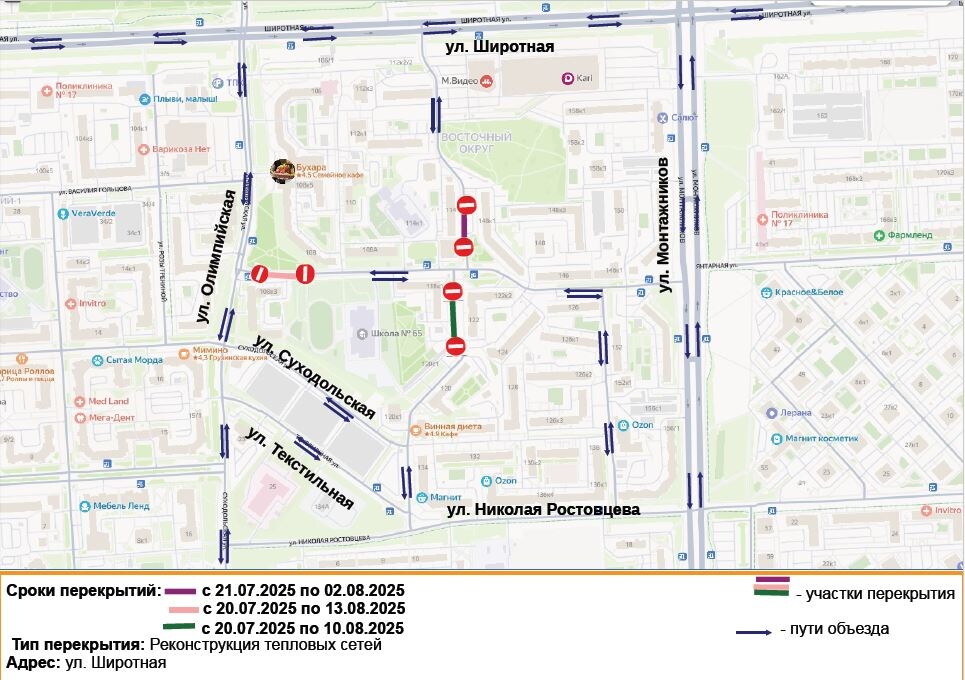Вниманию пользователей автомобильных дорог ⛔️В связи с реконструкцией участка трубопровода тепловой сети планируется прекращение движения на следующих проездах: - в районе дома № 108, к. 3 по ул. Широтной – в период с 20.07.2025 по 13.08.2025; - в районе дома № 148/1 по ул. Широтной – в период с 21.07.2025 по 02.08.2025; - в районе дома № 118, к. 2 по ул. Широтной – в период с 20.07.2025 по 10.08.2025. Участников дорожного движения просим обращать внимание на дорожные знаки, заранее планировать маршрут, соблюдать Правила дорожного движения РФ. Возможные маршруты объезда: ул. Николая Ростовцева, ул. Монтажников, ул. Широтная.