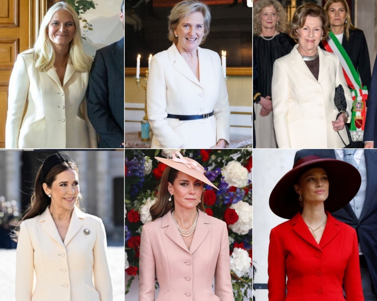 Вот такой популярный оказался жакет 💍 Кейт как минимум шестая! 🇩🇰 Королева Мэри носила его в апреле, когда они с Фредериком были с гос. визитом в Париже. Самый яркий вариант был у 🇲🇨 Беатрис Борромео на национальный день Монако в 2022 г. Также жакет носила сестра короля Бельгии, 🇧🇪 принцесса Астрид, и норвежские 🇳🇴 королева Соня и кронпринцесса Метте-Марит. 🙄 Назад