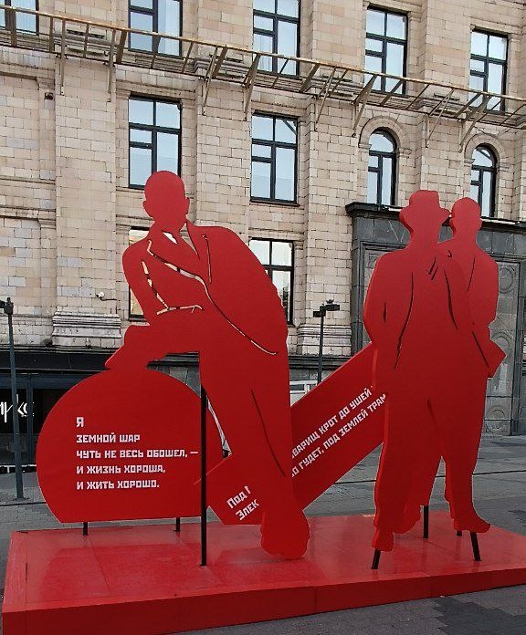 В Москве площадь Маяковского рядом с такой же станцией метро окрасилась багрянцем. В рамках проекта «Лето в Москве» здесь появились инсталляция в честь Маяковского, с кумачовыми силуэтами Владимира Владимировича, водоёмами с карпами кои и экранами, где крутятся архивные видео и мультфильмы по произведениям поэта революции. Мы привыкли именно так называть Маяковского ― никак иначе. А в новой постановке «Серебряный век. Эпоха в лицах» Московского театра «Мост» Владимир Владимирович суров, как частый посетитель бара «Бродячая собака» в Петербурге, читает стихи, вызывая неистовство своей, вроде бы, публики. Премьера спектакля состоялась под занавес юбилейного 25-го сезона.