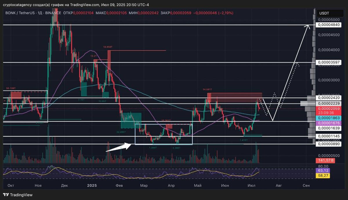 BONK сильно вырос в цене. Суточный объём торгов на LetsBonk... fun (площадка для торговли токеном) впервые обогнал Pump... fun, что вызвало дополнительный интерес и рост спроса. Что касается технического анализа, то цена оттолкнулась от зоны поддержки 0.01145$ - 0.00890$. После этого началось агрессивное восходящее движение. Также цена превысила уровень 0.01676$ (МА100 - скользящая средняя за 100 дней) и закрепилась выше, что является бычьим (положительным) сигналом. Ко всему этому RSI (индекс относительной силы) вышел в бычью зону (обычно выше 50), что говорит о силе покупателей. Лично я рекомендую продать часть монет, потому что текущий рост вызван слухами/новостями, а не фундаментальными изменениями. Если цена снизится до 0.01639$ буду вновь добирать актив на спот. Среднесрочные цели находятся в зоне сопротивления 0.03597$ – 0.04840$: это предполагаемые уровни, до которых цена может дойти в будущем. 👉Telegram 👉Trading View
